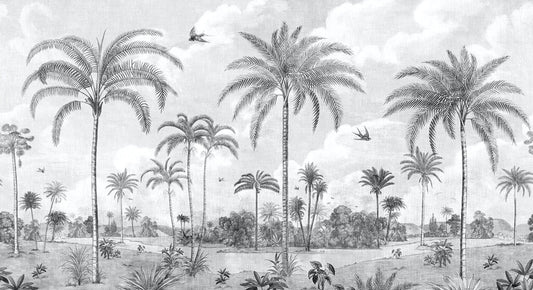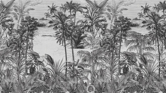 Siyah Beyaz Tropikal Orman ve Deniz Manzaralı Duvar Kağıdı