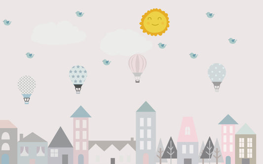 Bina, Balon ve Güneş Desenli 3D Duvar Kağıdı | Duvar Kağıdı Marketi