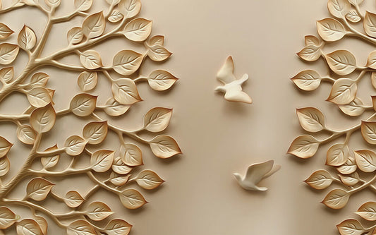Sarı Yaprak ve Kuş Desenli 3D Duvar Kağıdı | Duvar Kağıdı Marketi