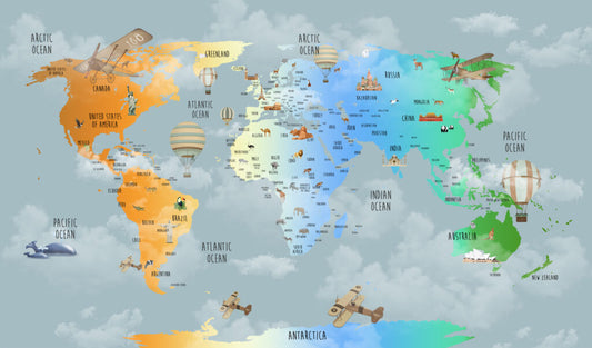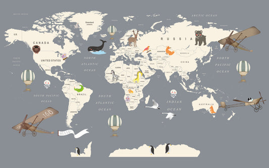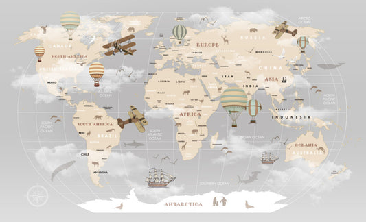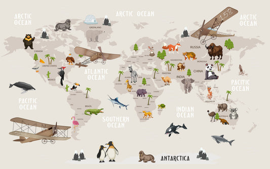 Uçak ve Hayvan Desenli Çocuk Haritası 3D Duvar Kağıdı | Duvar Kağıdı Marketi
