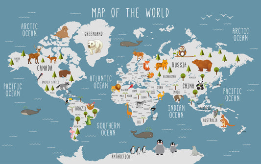 Soft Mavi Zemin'li Ağaç ve Hayvan Şekilli Çocuk Haritası 3D Duvar Kağıdı | Duvar Kağıdı Marketi