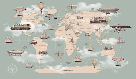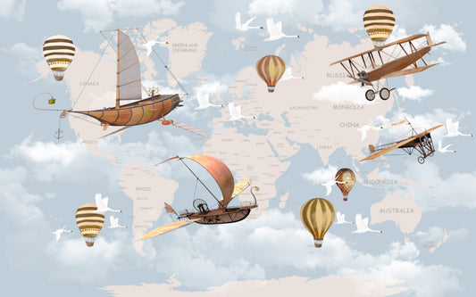 Uçak ve Gemi Desenli Çocuk Haritası 3D Duvar Kağıdı | Duvar Kağıdı Marketi
