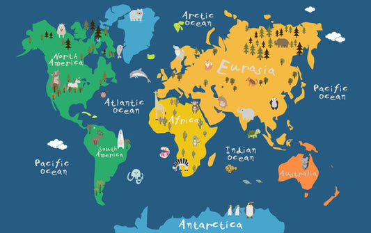 Mavi Zemin'li Hayvanlı Çocuk Haritası 3D Duvar Kağıdı