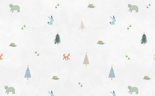 Beyaz Zemin Üzerin'de Hayvanlar Ve Ağaçlar Desenli 3D Duvar Kağıdı | Duvar Kağıdı Marketi