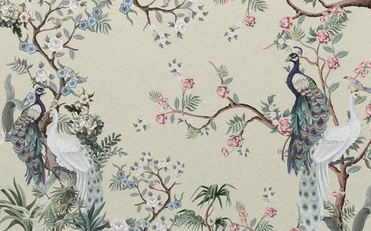 Krem Zemin'li Tavus Kuşları Ve Çicek Desenli 3D Duvar Kağıdı