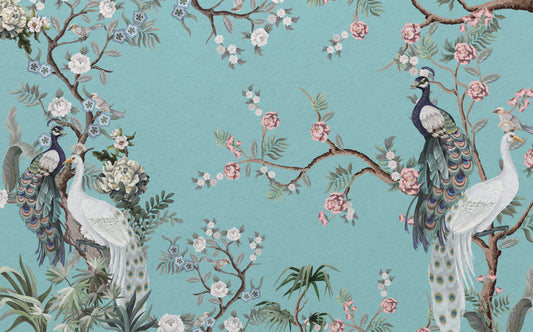 Turkuaz Zemin'li Tavus Kuşları Ve Çicek Desenli 3D Duvar Kağıdı