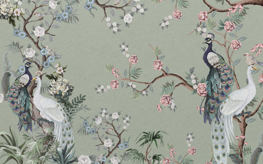 Yeşil Zemin'li Tavus Kuşları Ve Çicek Desenli 3D Duvar Kağıdı