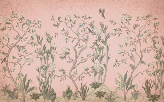 Pembe Zemin'li Soft Çiçekler ve Kuşlar Duvar Kağıdı