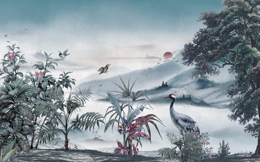 Bej Soft Tonlarda Leylek Ve Manzaralı Duvar Kağıdı