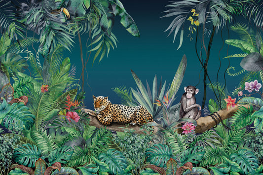 Mavi Tonlar'da Ağaçtaki Kaplan Safarili 3D Duvar Kağıdı