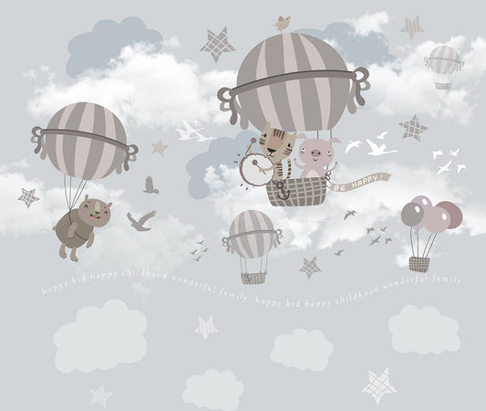 Soft Tonlar'da Uçan Balon İçerisinde ki Hayvanlar 3D Duvar Kağıdı