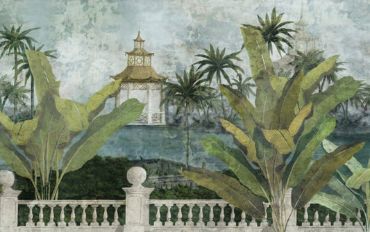 3D Ev ve Ağaç Desenli Tropikal Duvar Kağıdı