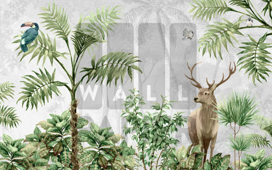 3D Geyik ve Ağaç Desenli Tropikal Duvar Kağıdı