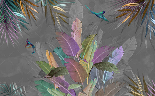 3D Çok Renkli Yaprak ve Kuş Desenli Tropikal Duvar Kağıdı