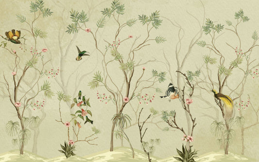 Fıstık Yeşili Kuş ve Çiçekli 3D Duvar Kağıdı | Duvar Kağıdı Marketi