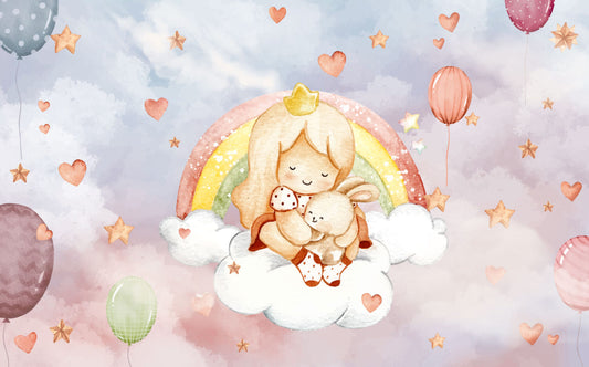 Gökkuşağı Bulutunda Tavşanlı Kız Sulu Boya Duvar Kağıdı