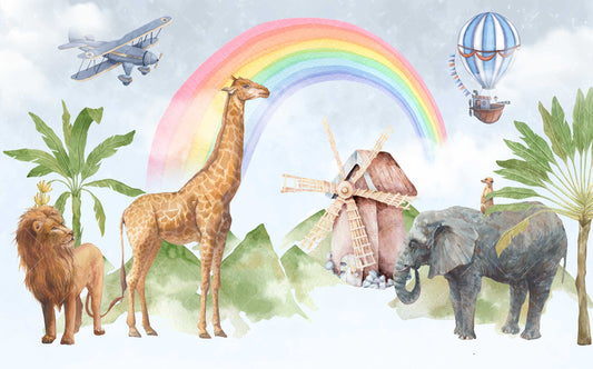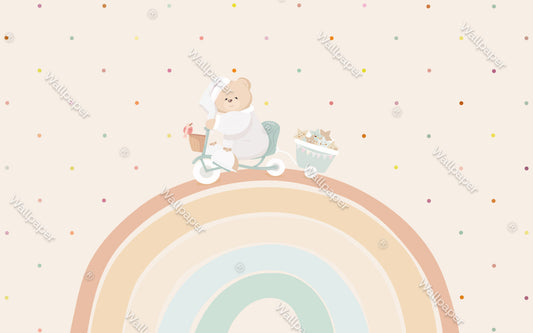 Gökkuşağı Manzaralı Balonla Uçan Ayı Desenli Duvar Kağıdı