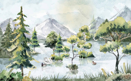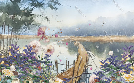 Göl Kenarında Çiçek ve Ağaç Desenli 3D Duvar Kağıdı