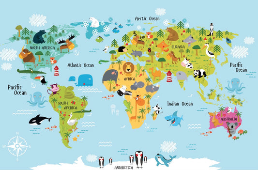 Hayvanlı ve Pusulalı Çocuk Dünya Haritası Duvar Kağıdı | Duvar Kağıdı Marketi
