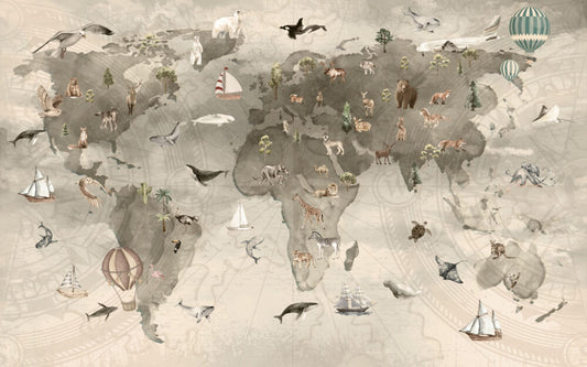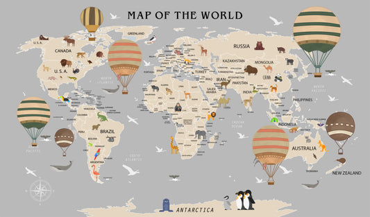 Hayvanlı ve Balonlu Dünya Haritası 3D Duvar Kağıdı | Duvar Kağıdı Marketi