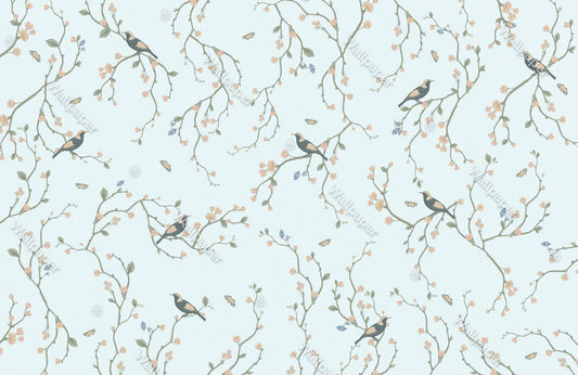 Kiraz Çiçekleri ve Kuşlar Mavi Duvar Kağıdı