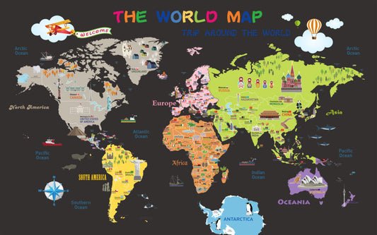 Koyu Zemin'li Ünlü Yapılar Çocuk Haritalı 3D Duvar Kağıdı