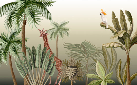 Krem Tonların'da Ağacın Etrafında Duran Papağan ve Zürafa Desenli 3D Duvar Kağıdı | Duvar Kağıdı Marketi