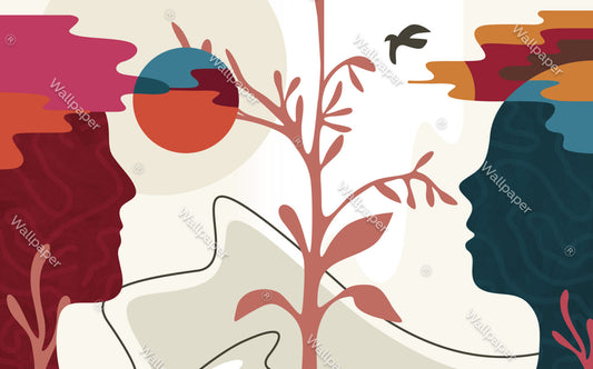 Krem Zeminli Çizgisel Portreler Duvar Kağıdı