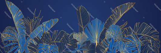 Altın Çizgisel Tropikal Orman Mavi Zemin Duvar Kağıdı