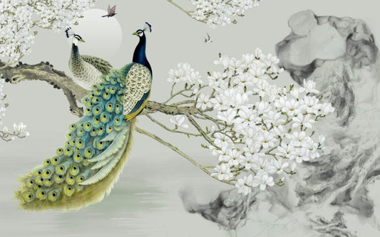 Tavus Kuşu Çiçekli 3D Duvar Kağıdı