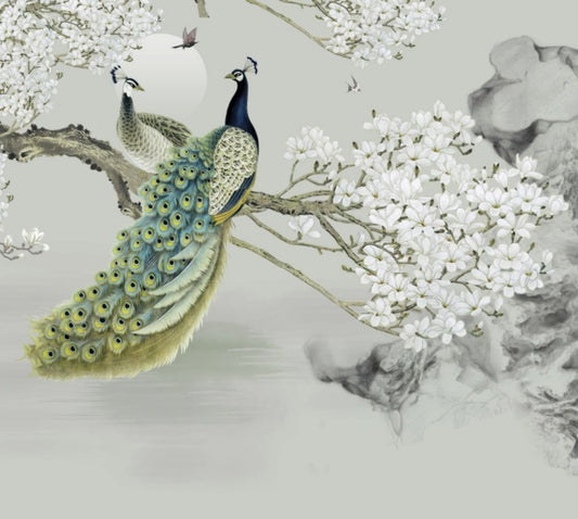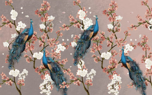 Kiraz Çiçekli ve Tavus Kuşlu 3D Duvar Kağıdı