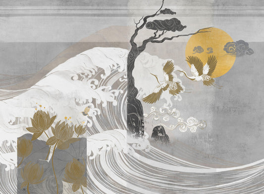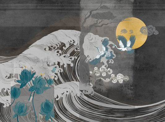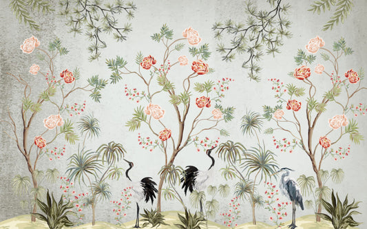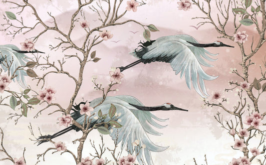 Leylekler ve Japon Gülleri 3D Duvar Kağıdı