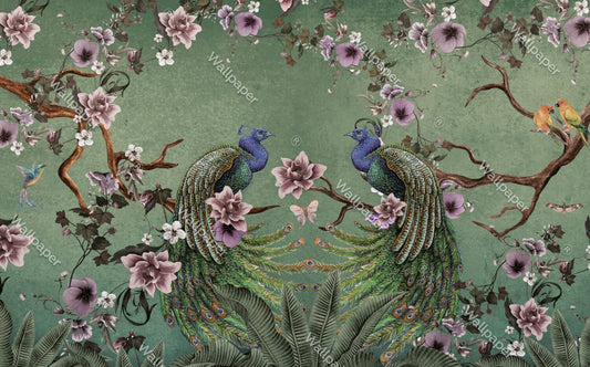 Yeşil Tonlarda Tavus Kuşları Ve Çiçekler Duvar Kağıdı