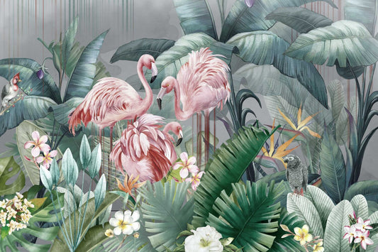 Tropikal Bahçede Flamingolu ve Papağanlı Duvar Kağıdı