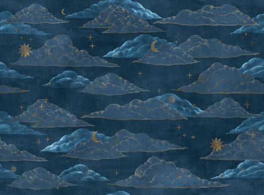 Koyu Mavi Tonların'da Ay, Yıldız ve Bulut Desenli 3D Duvar Kağıdı