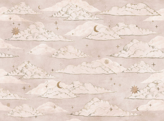 Pembe Zeminli Ay, Yıldız ve Bulut Desenli 3D Duvar Kağıdı
