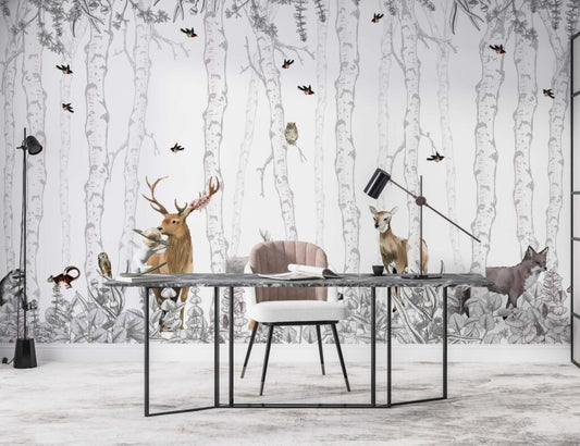 Siyah Beyaz Geyikli Ağaç Desenli Duvar Kağıdı