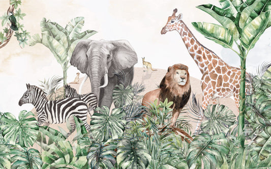 Ormanda Fil ve Zürafalı 3D Duvar Kağıdı | Duvar Kağıdı Marketi