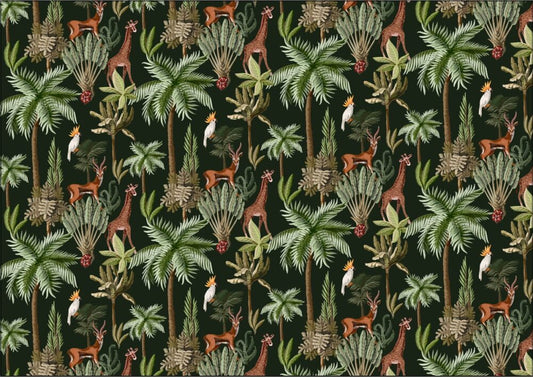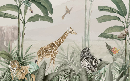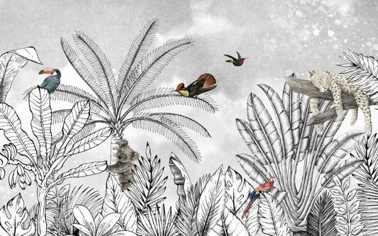 Karakalem Tropikal Ağaçlı Renkli Hayvanlar Duvar Kağıdı