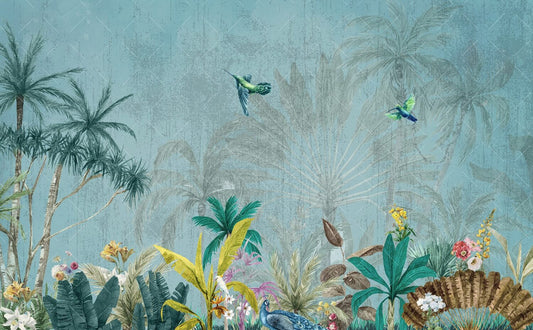 Mavi Tonunda Tropikal ve Kuşlu Duvar Kağıdı