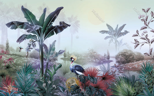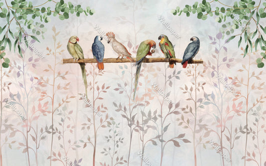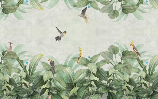 Papağanlar ve Tropikal Soft Yapraklar Duvar Kağıdı