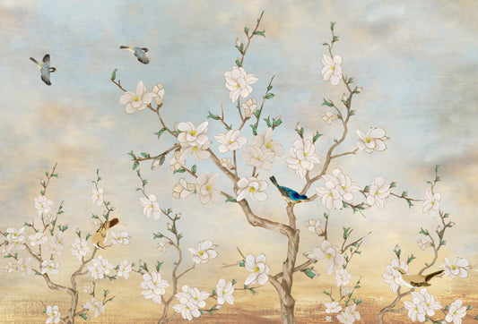 Uçan Kuşlar ve Çiçekli Ağaç Dalı Desenli 3D Duvar Kağıdı