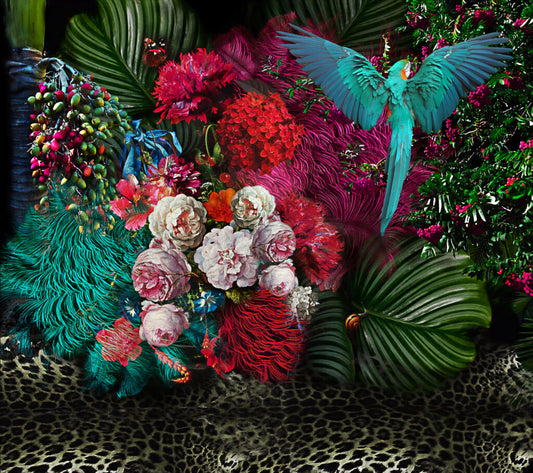 Papağan ve Renkli Çiçek Desenli 3D Duvar Kağıdı