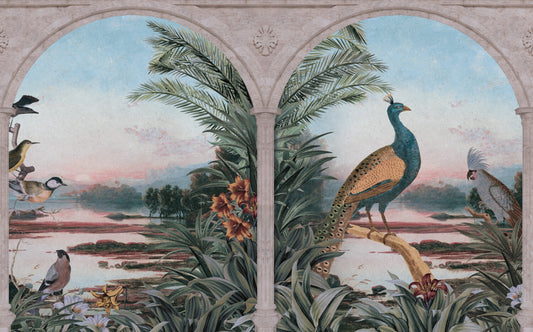 Yeşil Zemin'li Tavus Kuşları Ve Çicek Desenli 3D Duvar Kağıdı