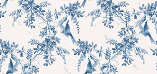 Mavi Tonlarda Yaprak Ve Kuşlar Duvar Kağıdı
