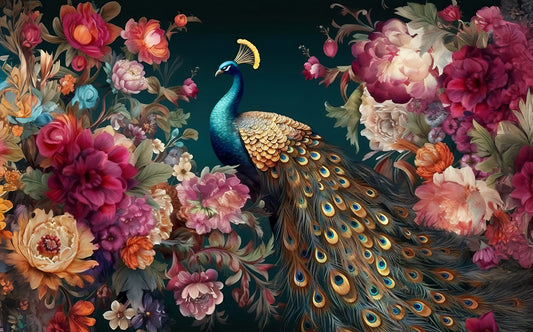 Mavi Tavus Kuşu ve Pembe Çiçekler Duvar Kağıdı