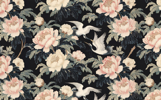 Şakayık Desenli ve Beyaz Turna Kuşlu Duvar Kağıdı