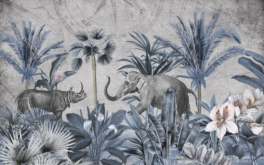 Mavi Tropikal Ormanda Fil ve Gergedan Duvar Kağıdı