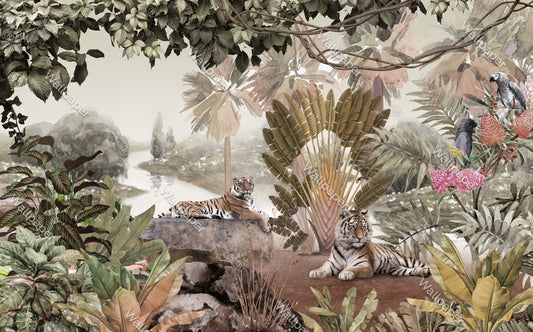 Tropik Ormandaki Kaplanlar ve Kuşlar Duvar Kağıdı