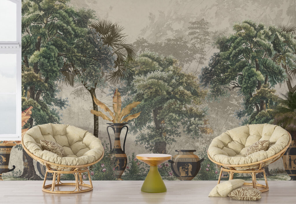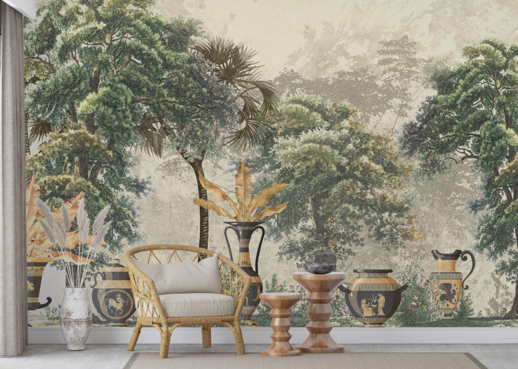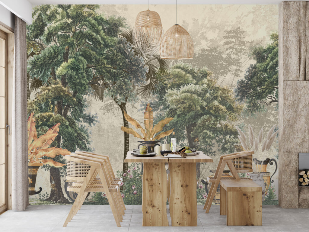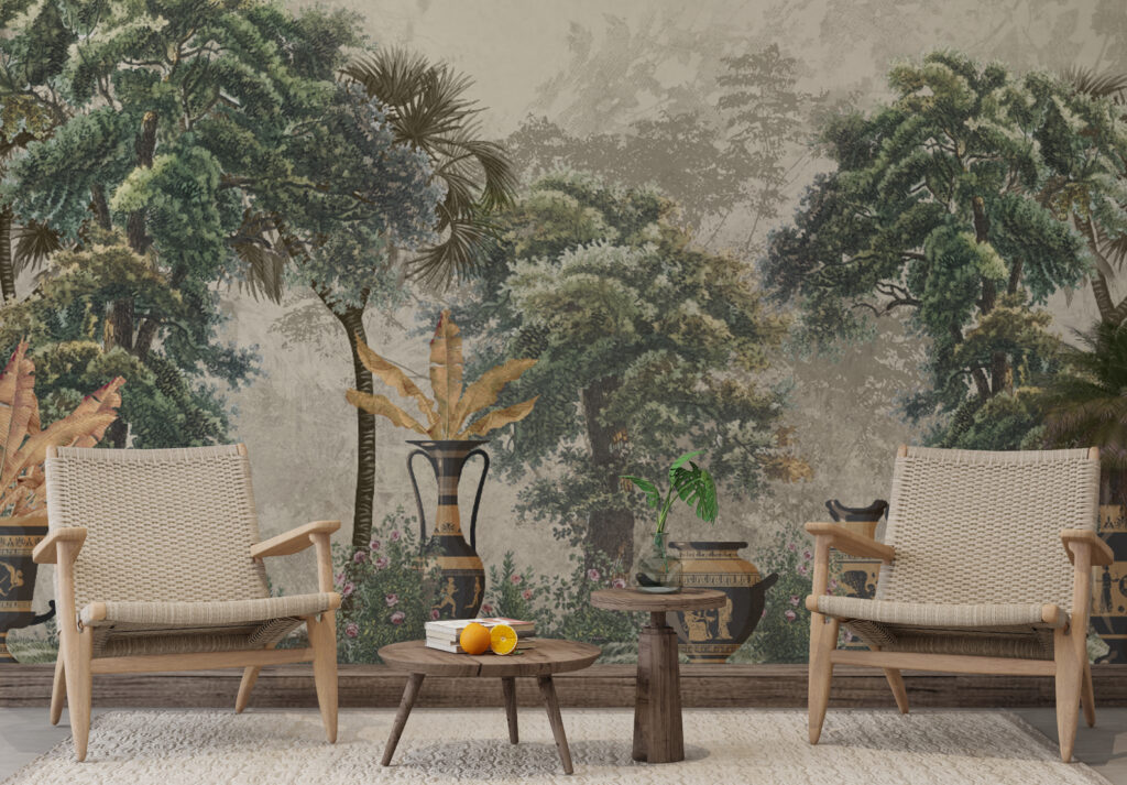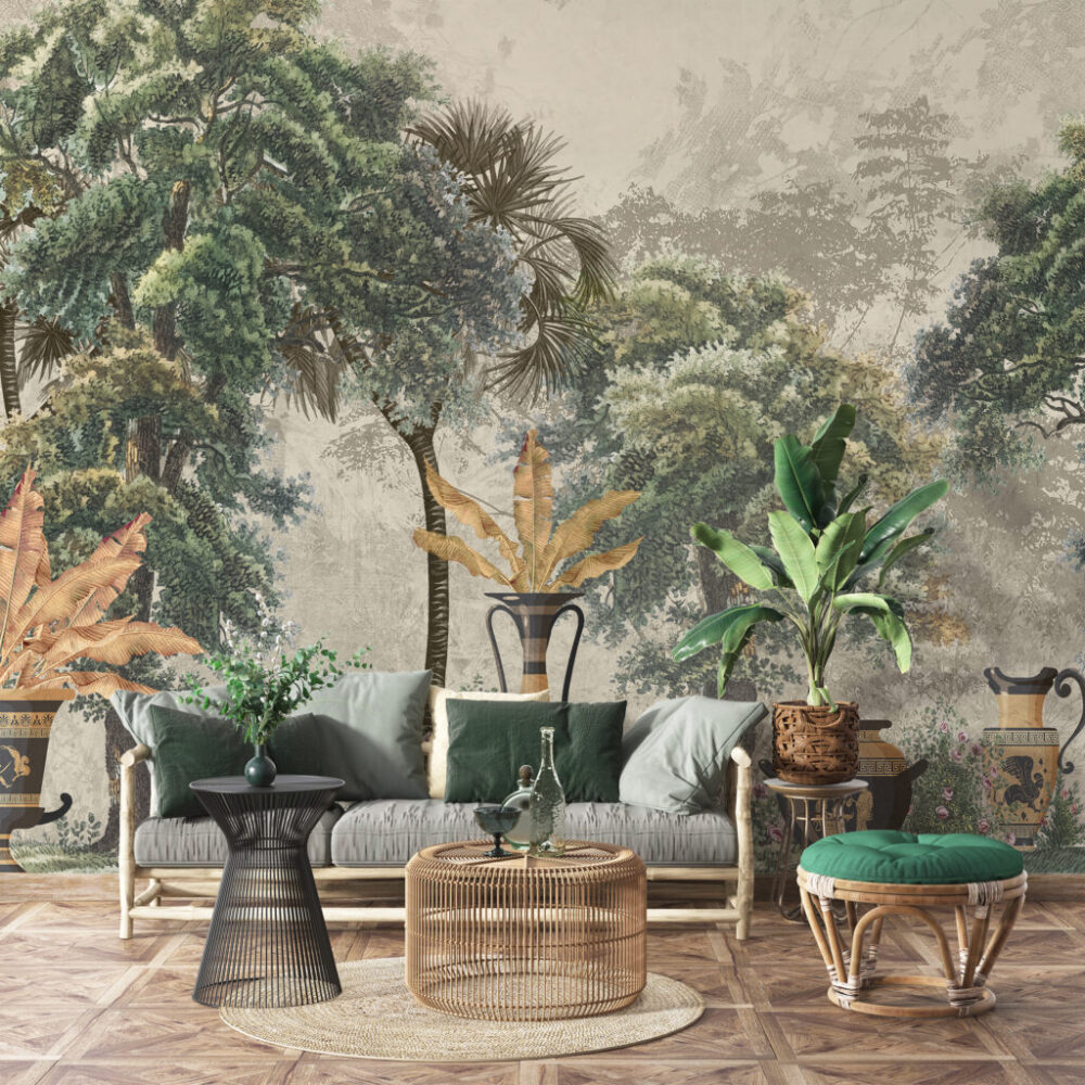 3D Ağaç ve Saksı Desenli Tropikal Duvar Kağıdı